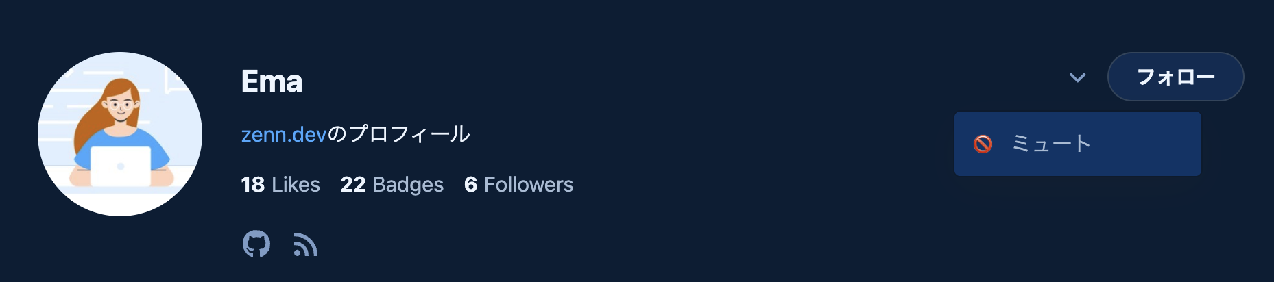 ユーザーページのメニューボタンよりユーザーのミュートが可能