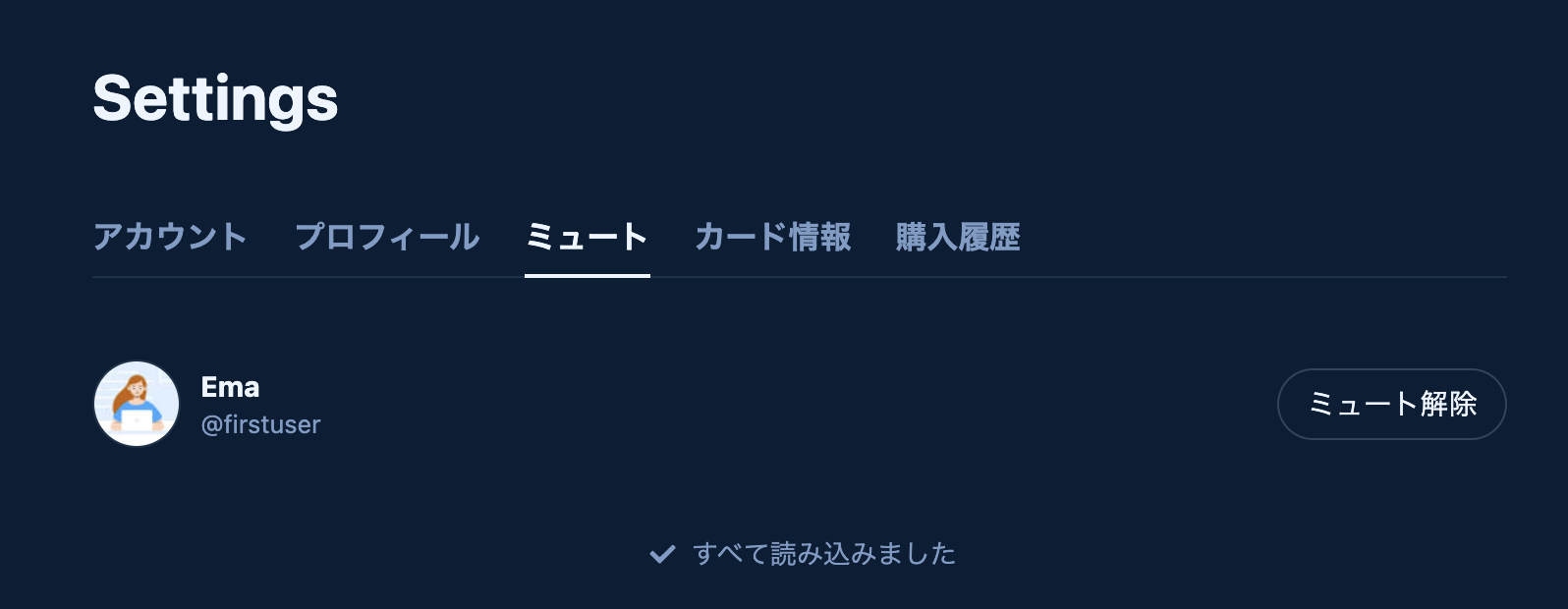 自身がミュートしているユーザー一覧の確認や解除については、アカウント設定ページの「ミュート」タブから行うことができます。