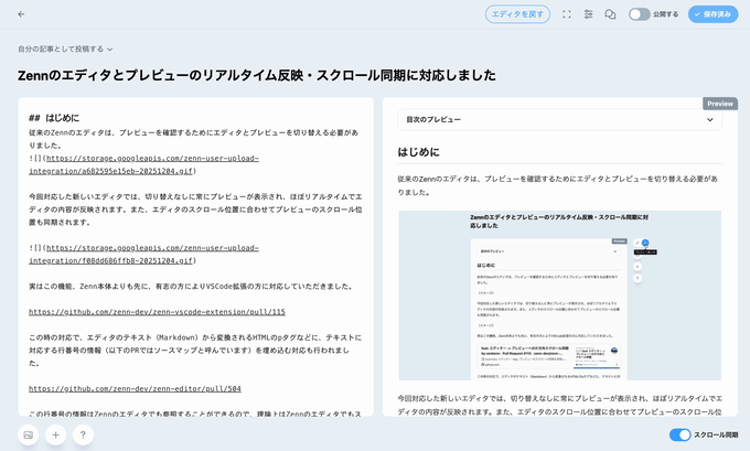 - スクロール同期: エディタとプレビューのスクロール位置が同期されます。